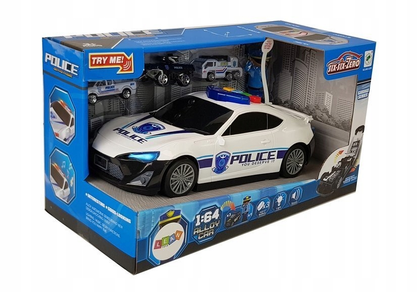 Наклейки, обтекаемая форма и тонировка стекол придают автомобилю искры. Остальные элементы набора — дополнительный сюрприз: фигурка полицейского, 3 небольшие полицейские машины. Маленькие полицейские машины выполнены в масштабе 1:64, поэтому легко помещаются в большую полицейскую машину. Они изготовлены из металлических и пластиковых элементов, полностью безопасны для детей, без острых краев. Два из них белые и один черный.