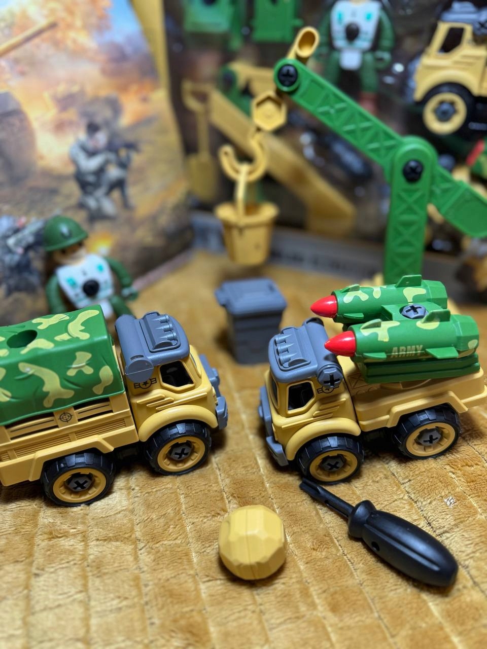 предназначен для детей от 3 лет. В набор входят различные элементы, позволяющие собирать и разбирать военную технику, а также кран.