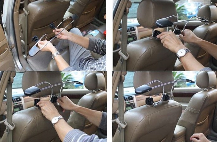 - Вешалка предназначена для всех типов автомобилей, оснащенных подголовником на двух ножках. Очень простая сборка: просто сожмите ножки вешалки и вставьте ее под подголовник.