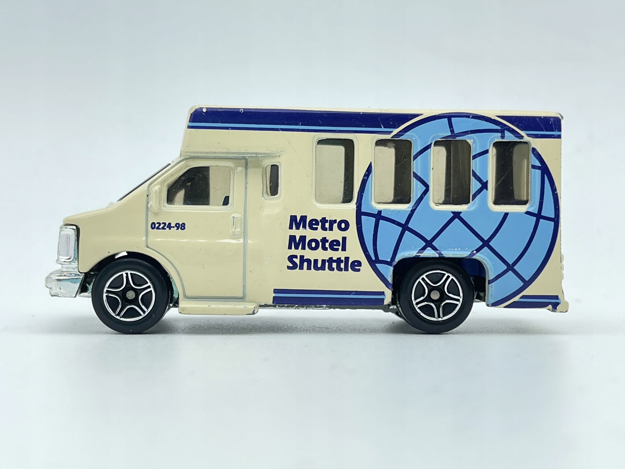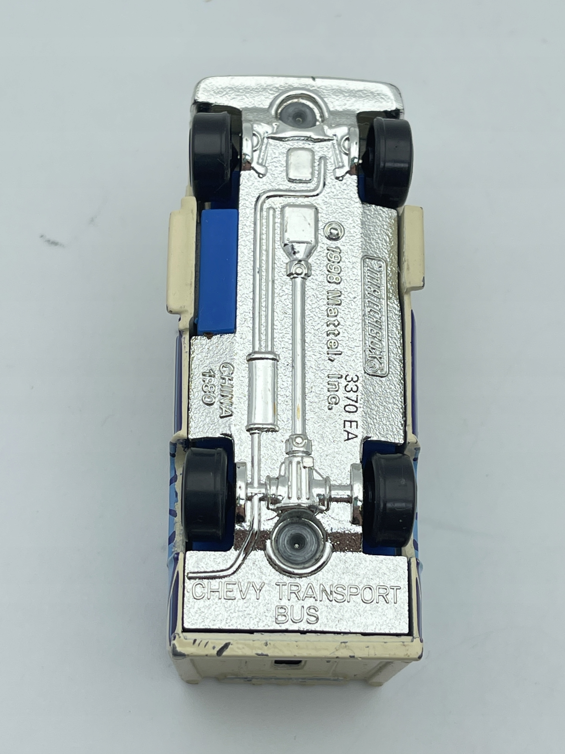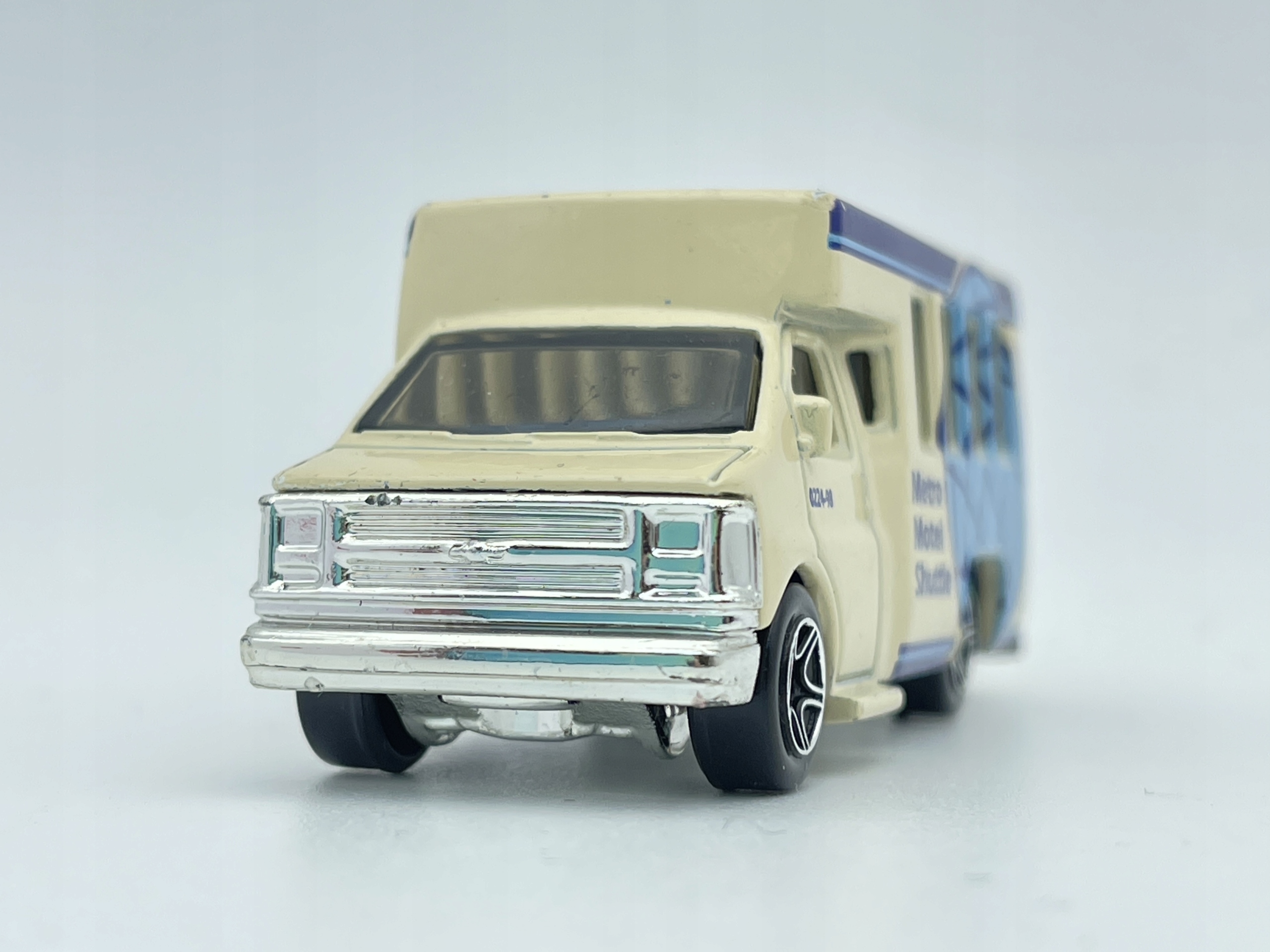 Модель Chevy Transport Bus вдохновлена классическими транспортными автобусами, что подчеркивается бежевыми цветами и принтом «Metro Motel Shuttle». Стиль 90-х проявляется в синих и черных деталях, которые придают ему особый вид. Может принадлежать к серии городских или транспортных машин.