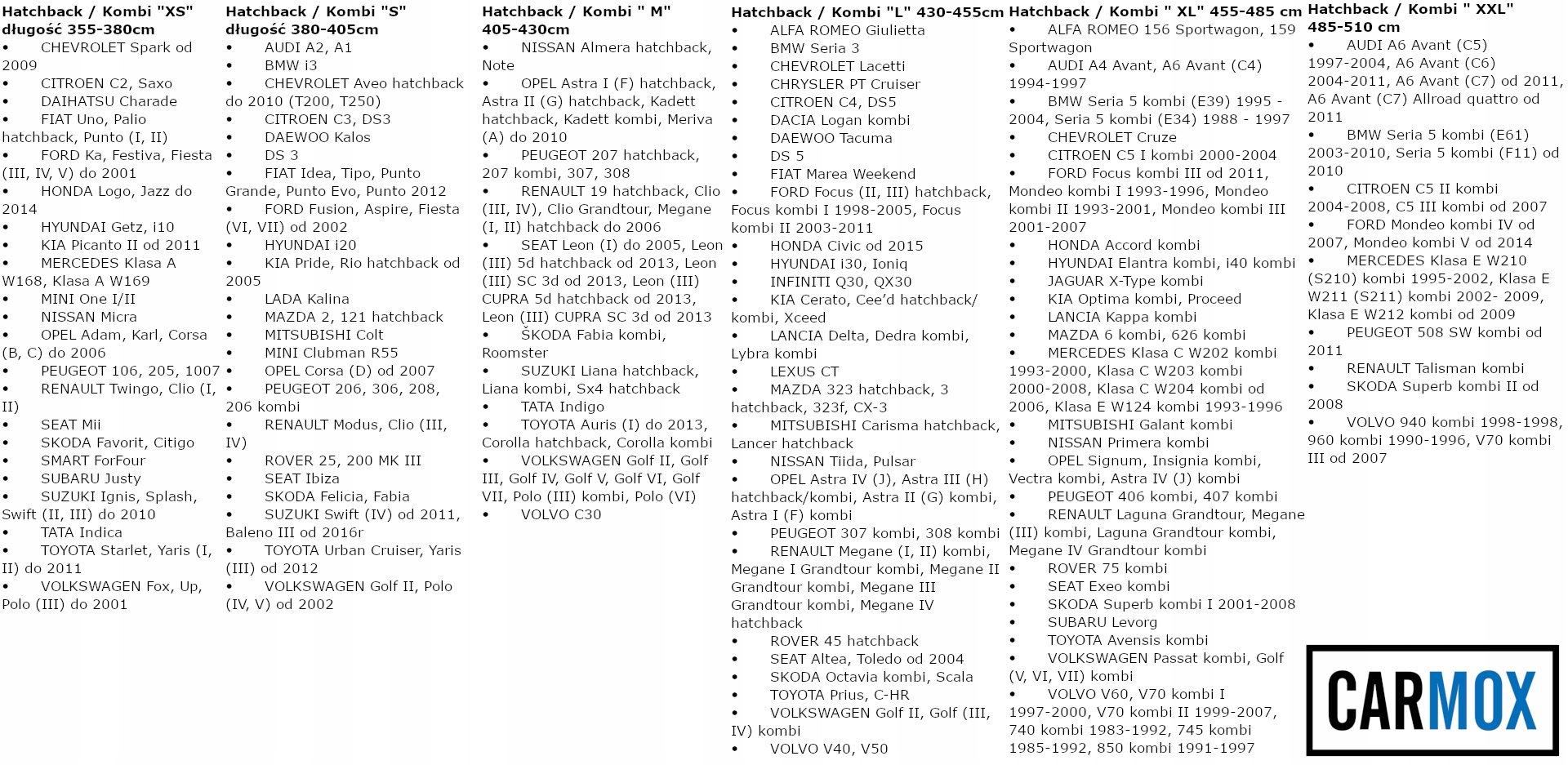 Ниже приведены доступные размеры для версий хэтчбек/универсал и седан – после покупки пришлите нам размер, который вы хотите отправить, или марку и модель автомобиля вместе с хэтчбеком. /версия кузова универсал или седан)