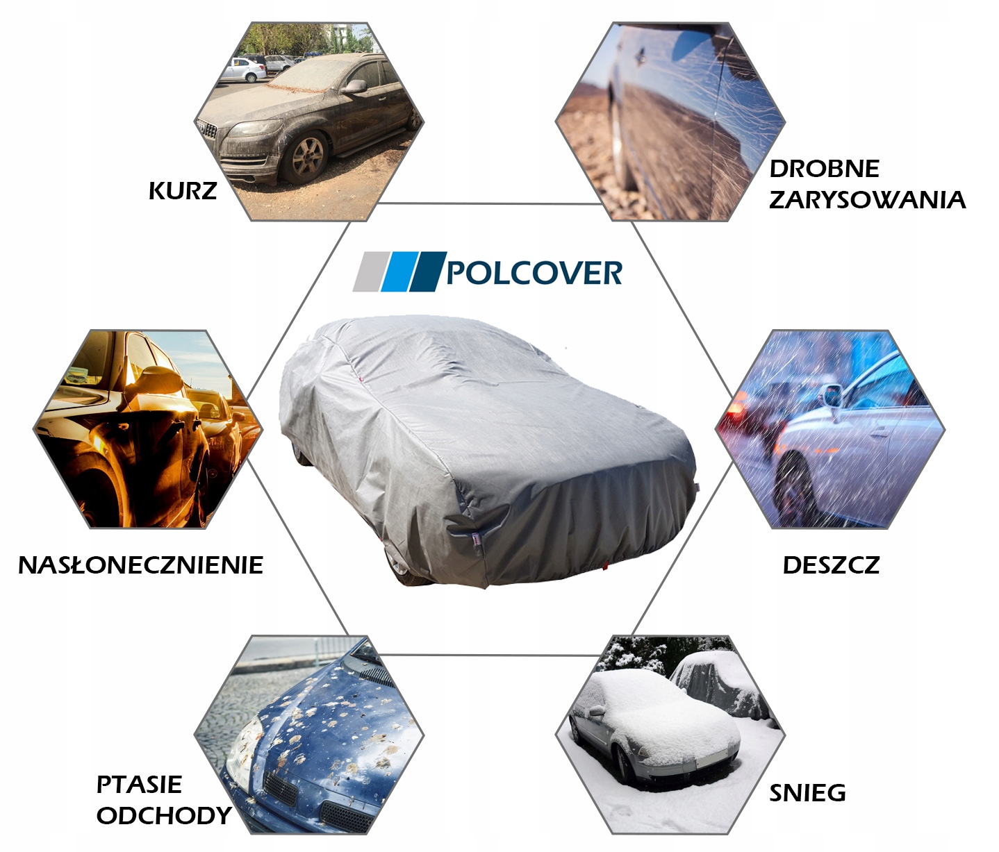 Многослойный, очень прочный, всесезонный автомобильный чехол польской компании POLCOVER, изготовленный из полипропиленовых материалов. . Чехол водонепроницаемый (по всей верхней части имеет встроенную фольгу) и дышащий - материал по бокам чехла имеет микропоры, отводящие влагу.