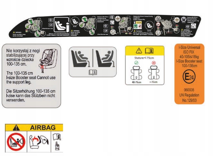 предупреждения: Примечание: это удерживающее устройство для детей категории «i-size». Он получил одобрение в соответствии с правилами № 129 для использования в местах сидения категории «I-Size», указанной производителями транспортных средств в инструкциях транспортного средства. В случае сомнения, вы должны проконсультироваться с производителем или продавцом розничной торговли устройства. Примечание: Не используйте устройства, стоящие перед направлением, если возраст ребенка не превышает 15 месяцев (вы должны ссылаться на инструкции).