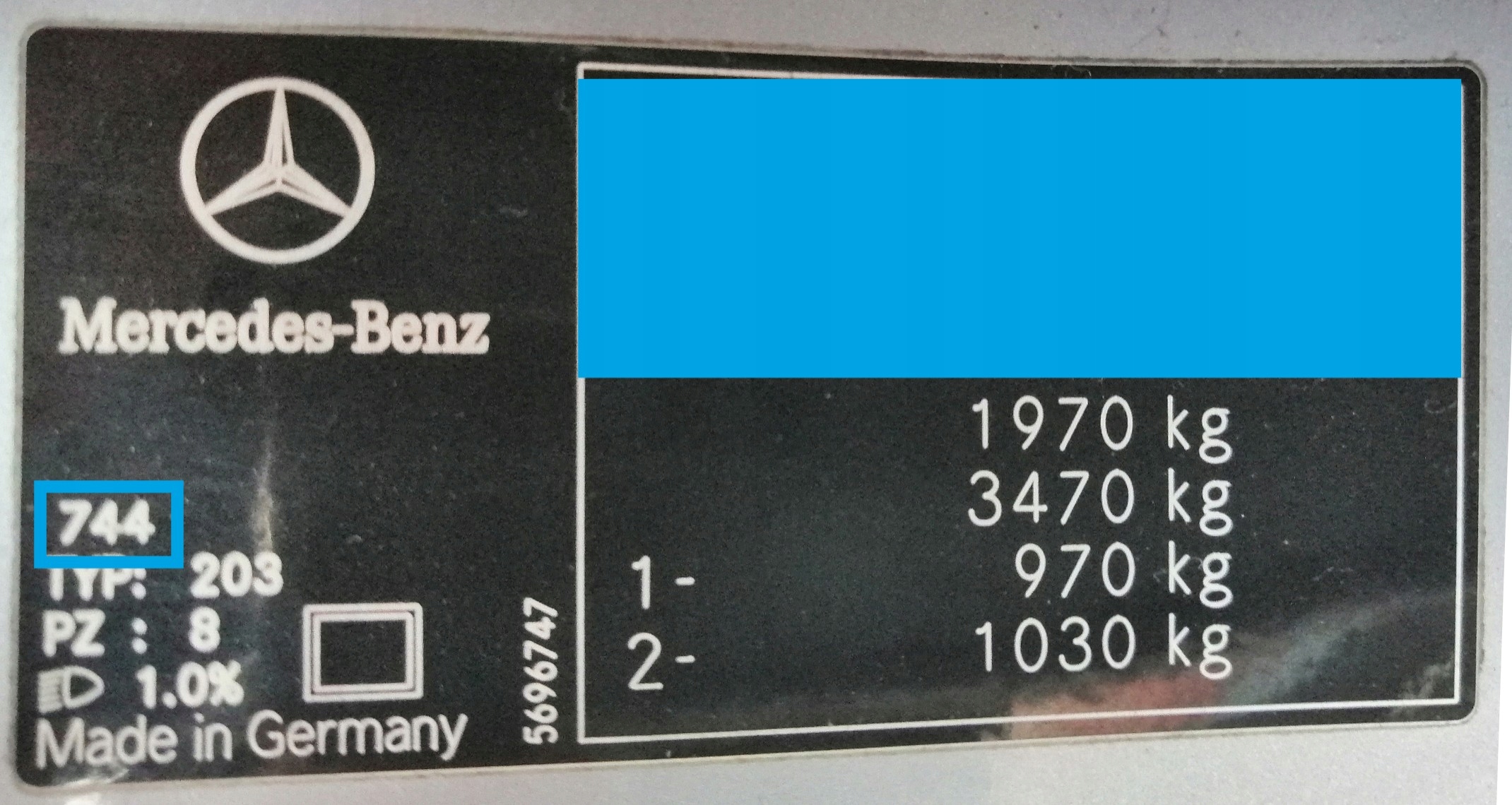 Цветовая маркировка в автомобилях Mercedes может располагаться в двух местах. Черную наклейку или цветную табличку чаще всего размещают на стойке водительской двери. Если его нет, предлагаем тщательно обыскать пространство под капотом автомобиля. На фотографии ниже цветовой код MERCEDES 744 обведен синей рамкой.