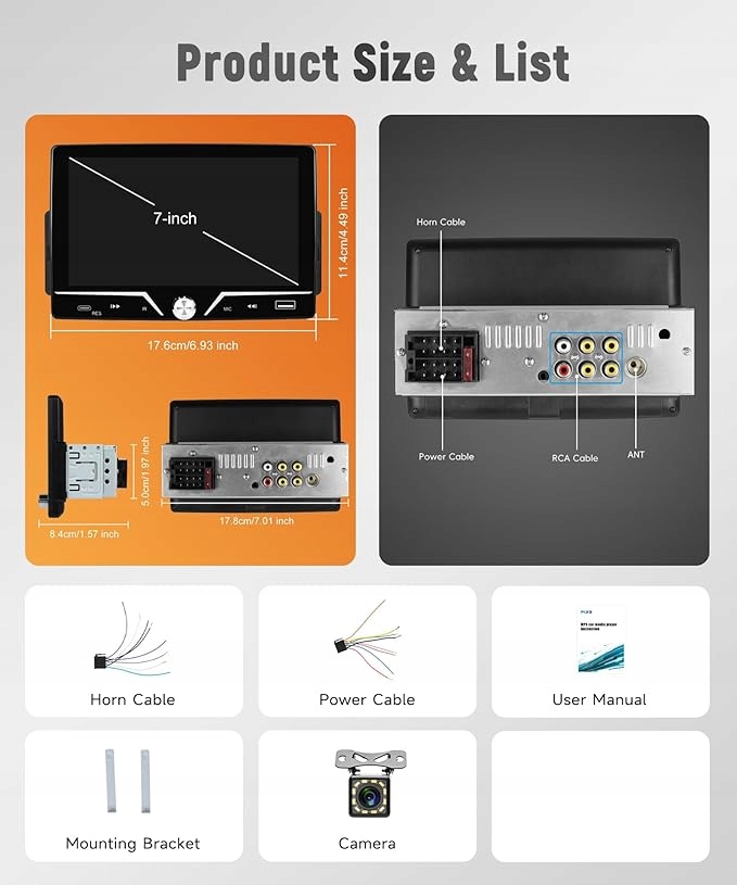 - кабели: разъем питания, функциональный разъем, разъем RCA камеры заднего вида/антенна Wi-Fi и Bluetooth, разъем USB-порта