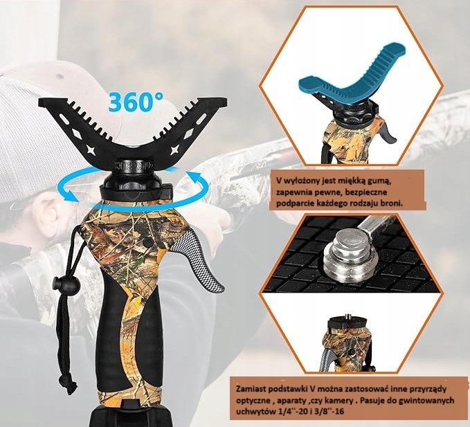 - V-образная, вращающаяся на 360 градусов база оружия, съемная, после ее отвинчивания можно установить фотокамеру, дальномер, фотоаппарат, зрительную трубу, бинокль или прибор ночного видения на резьбе.