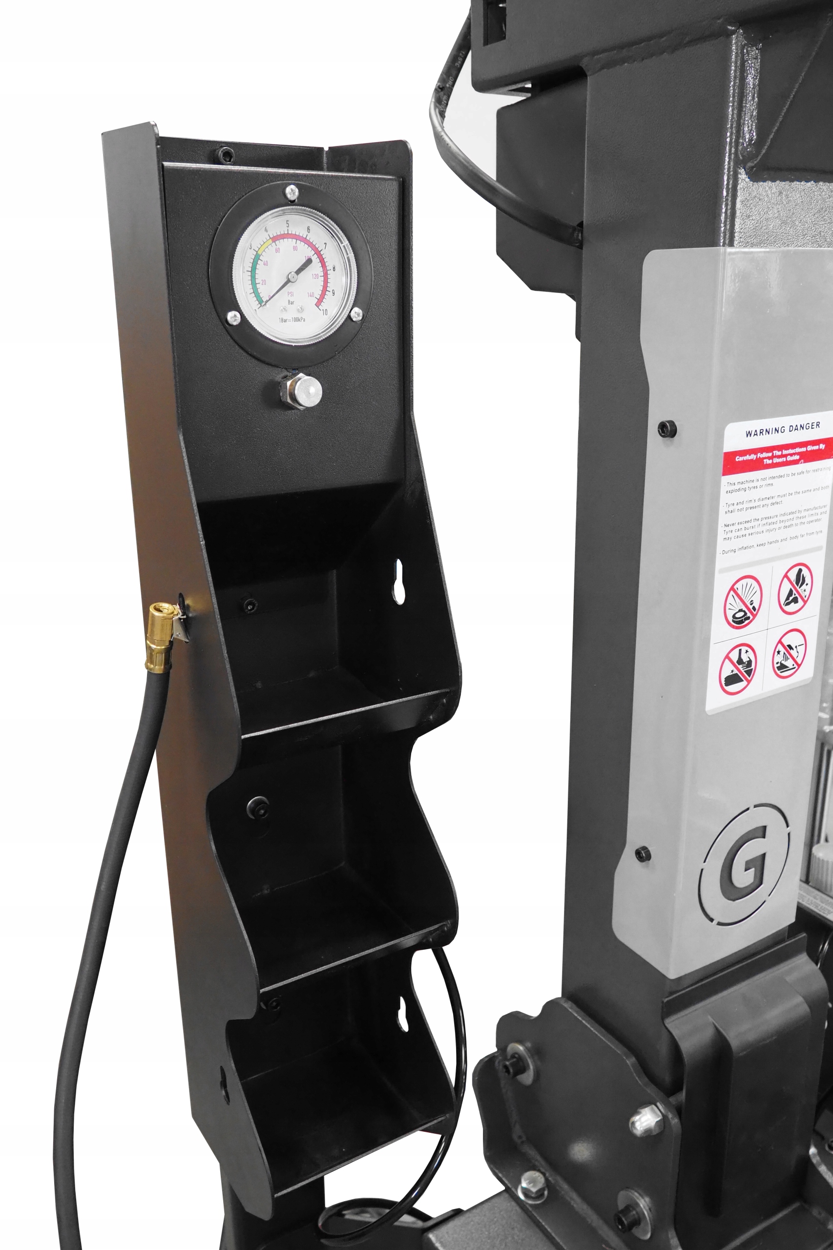 - Шиномонтажный станок имеет встроенный монометр и дополнительную педаль для эффективной подкачки шин ul>