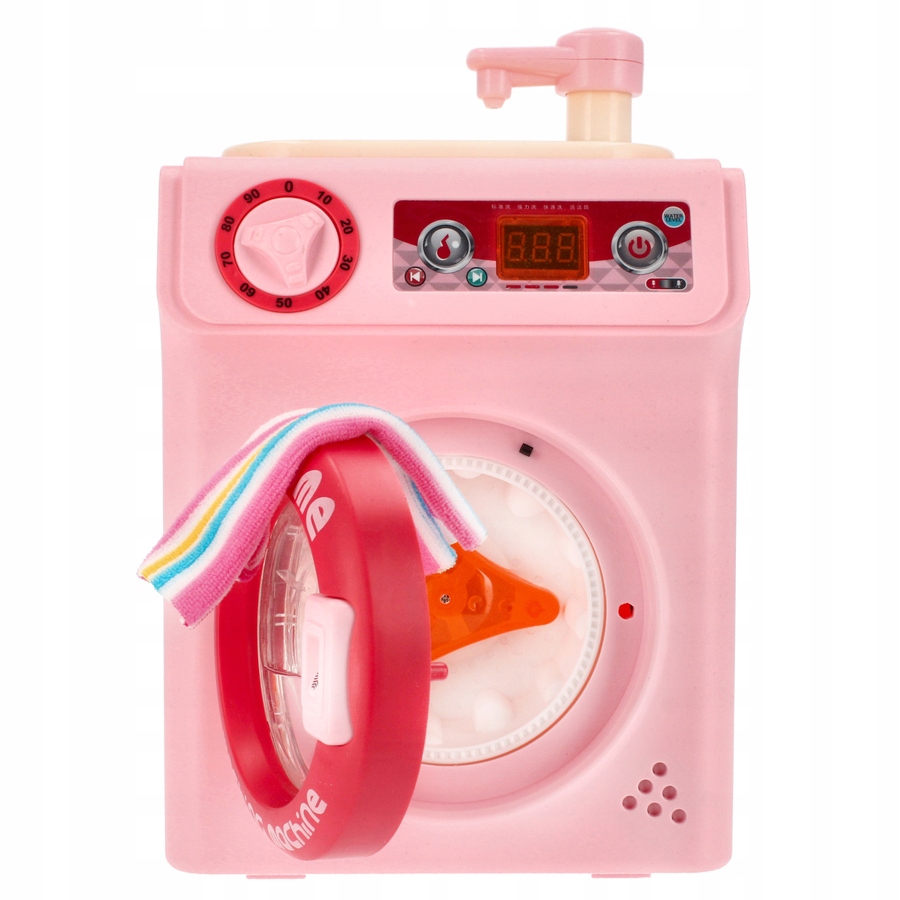 Преимущества изделия: стиральная машина имеет звуковые и световые эффекты, барабан стиральной машины вращается при включении, есть функции стирки, полоскания и отжима, после стирки ее можно выдвинута,стиральная машина при стирке розового цвета,также издает звуки.Вверху стиральной машины расположена небольшая раковина и кран,из которого течет вода после наполнения.