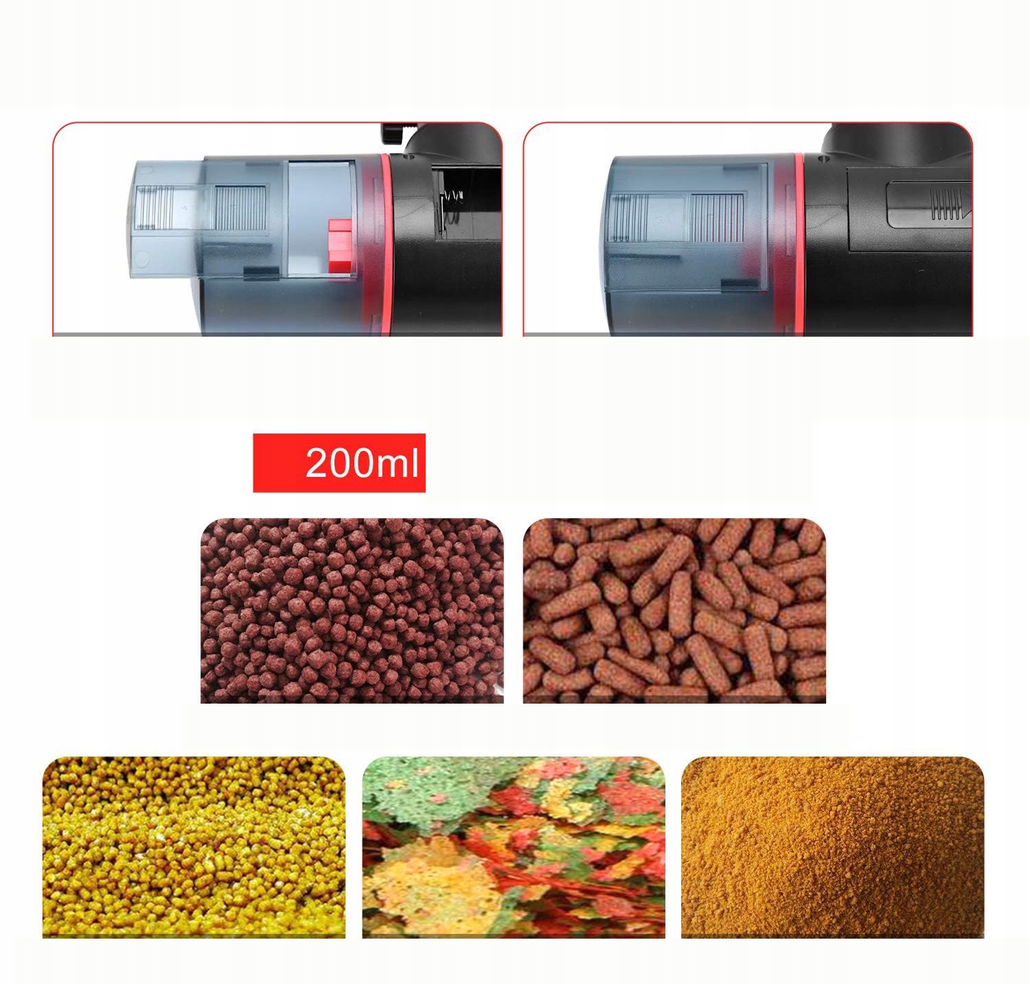 - Большое ведро для корма емкостью 200 мл подойдет для большей части вашего отпуска и подойдет для различных кормов для рыб, таких как хлопья, гранулы, порошки и полоски, будьте уверены. В верхнюю часть автоматической кормушки для рыбы легко добавлять корм для рыб, не нужно снимать ведро для корма.