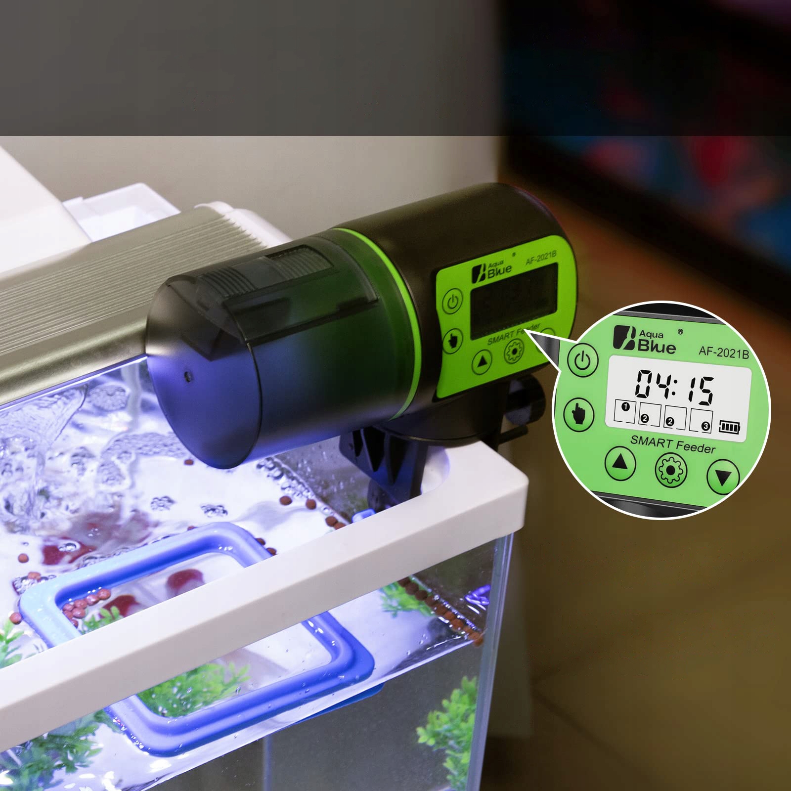 Окошко дозатора корма для домашних животных в аквариуме полностью регулируется.