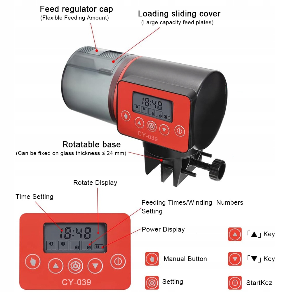 Количество дозировки может быть скорректировано вручную; Полупрозрачный дизайн обеспечивает легкую и удобную дозировку пищи для рыбы.