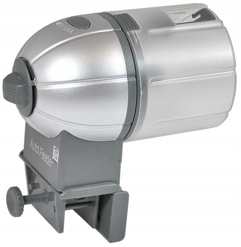 Прибор питается от двух батареек LR6 типа АА 1,5В. Кормушка имеет две кормушки: 50г и 100г, а также два варианта крепления - на боковом и защитном стекле аквариума!