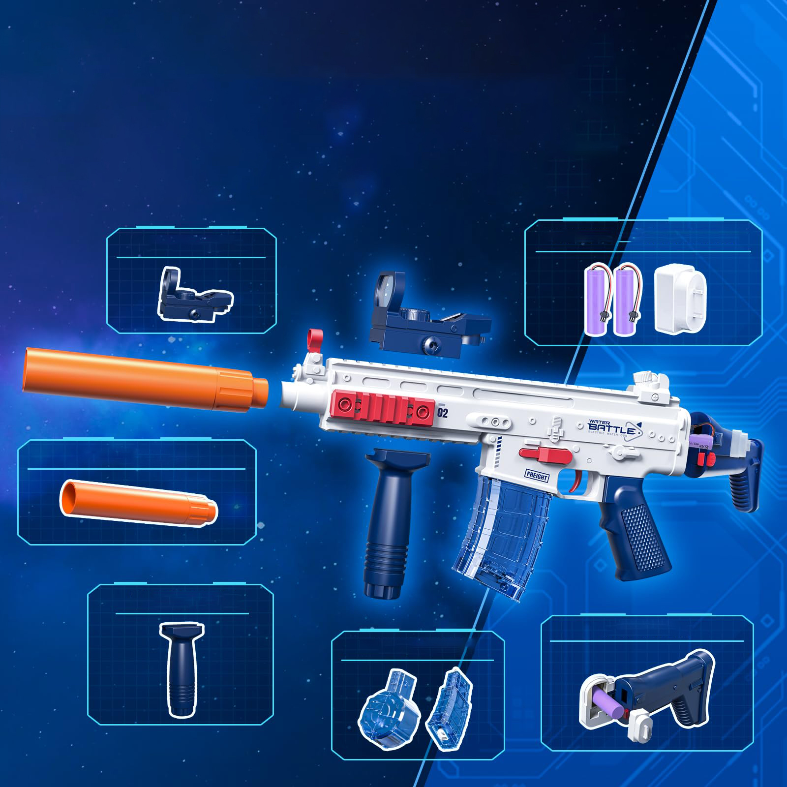 - Этот новый электрический пистолет для воды устраняет ручной режим верхнего -образец традиционных водных пистолетов. Он оснащен быстрым двигателем, который сразу же производит надстройку воды после простого нажима триггера.