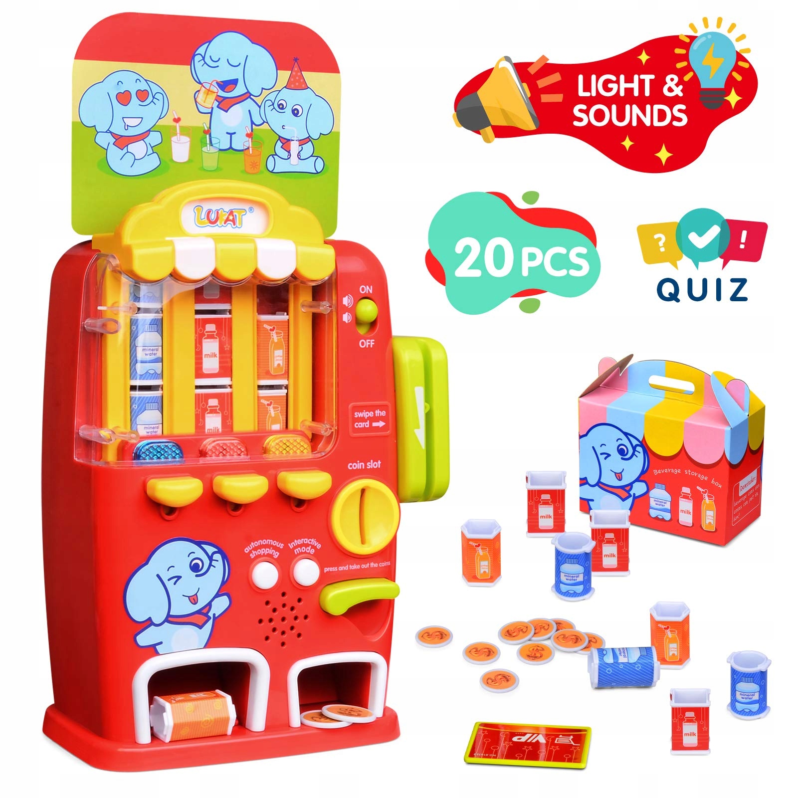 - Многофункциональная игрушка для детей - наша машина оснащена множеством банок с напитками и монетами. Реалистичный голос дает детям реальное чувство торговой машины. Ребенок может играть с моделированием кредитных карт или монет, а затем нажимать кнопку, чтобы напиток выпал. Реальная игра торговых автоматов продаж осуществляет мечту ребенка после осмотра достопримечательностей. Внешний вид машины яркий и красочный, дети будут любить их так сильно