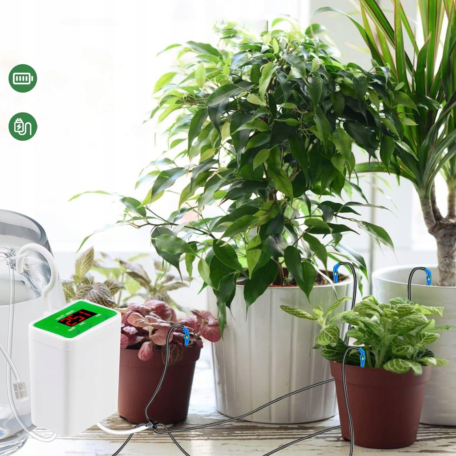 - Система Система орошения горшка имеет встроенную литиевую батарею емкостью 2000 мАч и может работать в течение 2-3 месяцев.