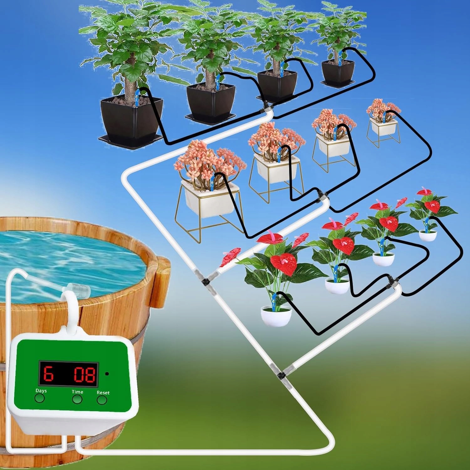 - Позвольте вам путешествовать без забот, система праздничного орошения может поливать ваши растения, когда во время отпуска нет электричества, например, цветочные горшки на балконе, в гостиной, в помещении и на открытом воздухе, в цветочном магазине и в саду.