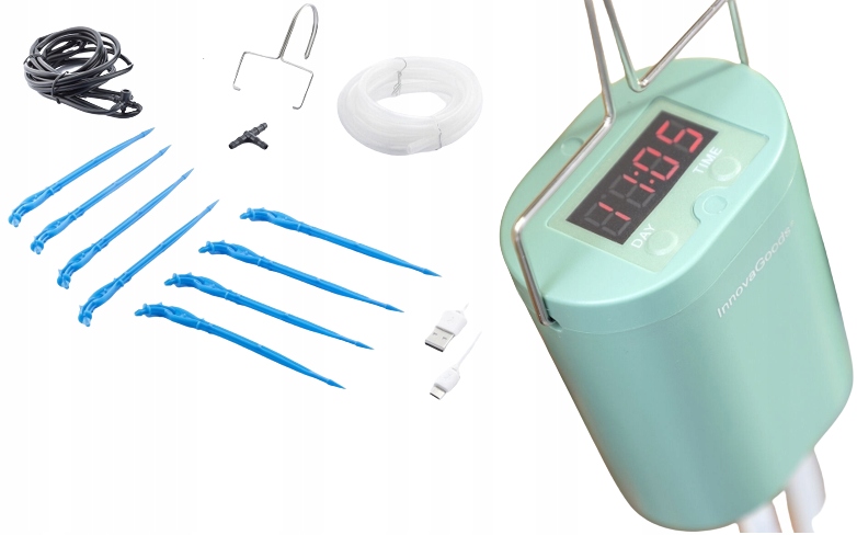Это современное устройство для полива работает от аккумуляторных батарей (в комплект входит USB-кабель для зарядки микро-USB) и является программируемым, поскольку имеет цифровой таймер, указывающий перерыв между поливными днями (от 1 до 9 дней) и продолжительность полива. за секунды.
