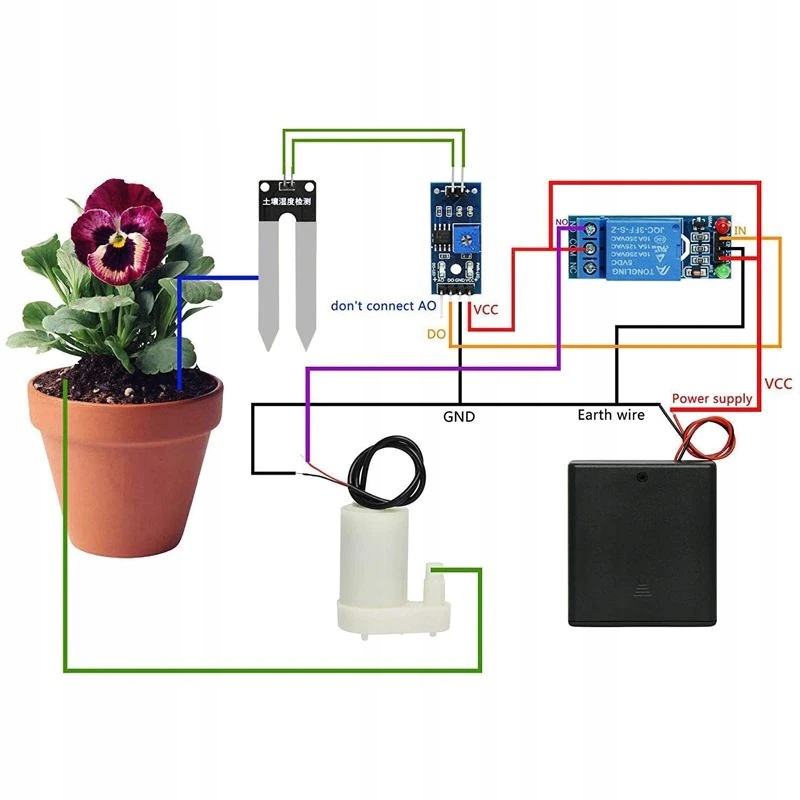 2. Проверьте модуль датчика влажности почвы: подключить модуль Fork, и GND -модуль, подключенная к модулу, подключен к 5 v. В находе всегда включен красная силовая лампа, зеленый (синий), указывающий на цвет лампы, мигается один раз, когда вилка находится непосредственно к воде, она будет освещена зеленым (синим) диодом;