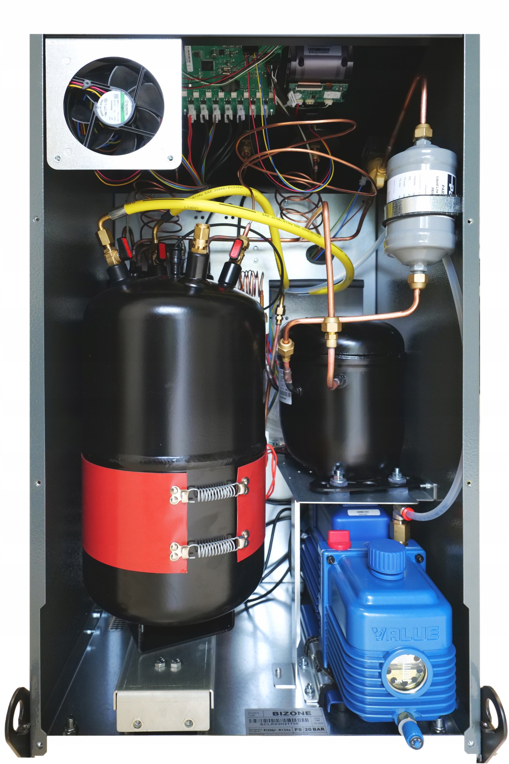 Когда станция выполняет вакуумирование, нагревательный ремень автоматически включается. Таким образом, он нагревает хладагент, собранный в цилиндре. Повышение температуры с 20-40°С вызывает повышение давления с 5,5 до 9 бар.