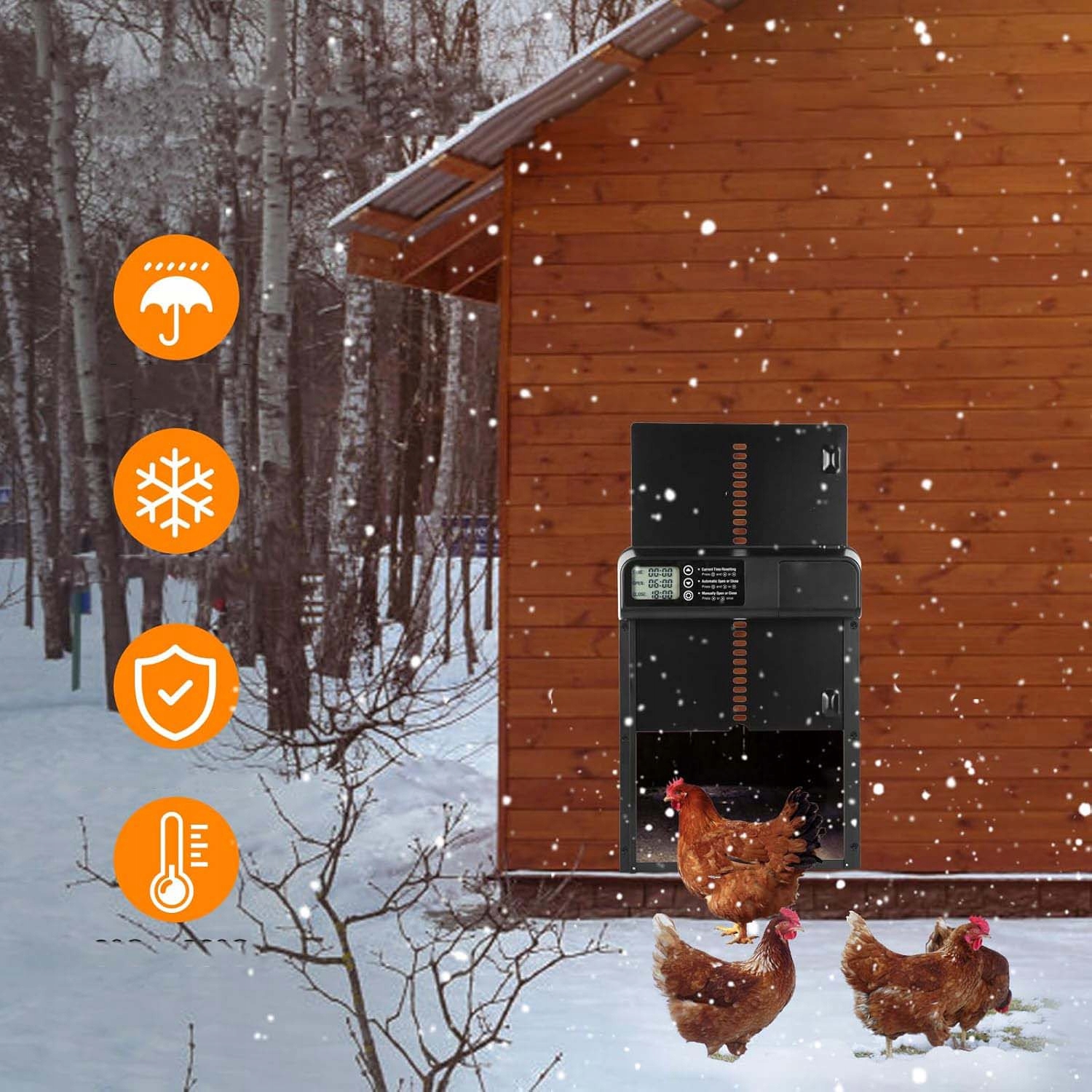 🐤 【Автоматическая дверь к курятнику】 электрический куриный лоскут изготовлен из АБС и алюминия, она безопасна и надежная, водонепроницаемая IPX4, устойчивая к высоким температурам и холодным. Все необходимые инструменты сборки находятся в сфере доставки, включая отвертку и 10 винтов. Таймер можно точно установить для автоматического открытия двери утром и автоматически закрыть вечером. Независимо от того, находитесь ли вы в путешествиях или просто наслаждаетесь расслабляющим утро, вы можете быть уверены, что ваши цыплят будут в хороших руках, не ограничивая время и свободу. В то же время двери Henhouse оснащены передовой технологией защиты от заклинивания, которая автоматически останавливается после обнаружения препятствия, так что птица не пострадает. Это преимущество о том, что оно не влияет на изменение погодных условий и означает, что курятник работает оптимально под дождем или на солнечном свете. Интуитивно понятный дисплей автоматической куриной двери - по -детски для использования и предназначен для подходящих для пользователей всех возрастов