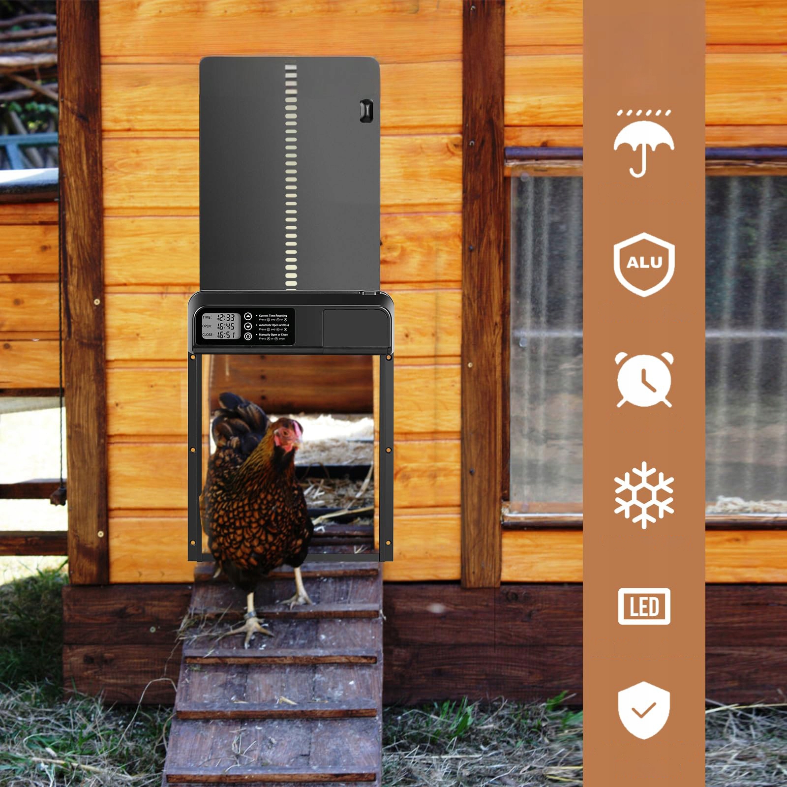 【Высокое качество】: электрическая автоматическая куриная заслонка с ABS и процессом окисления алюминиевого сплава, устойчивость к высоким и низким температурам, защита от ржавчины и коррозии, водонепроницаемость IPX4, питание от 3 батарей типа АА (БАТАРЕИ НЕ ВХОДЯТ!!!), с водонепроницаемым аккумуляторным чехлом, который не попадет в воду. Примечание. Батарейки должны быть щелочными, низкий заряд батареи приведет к плохой работе.