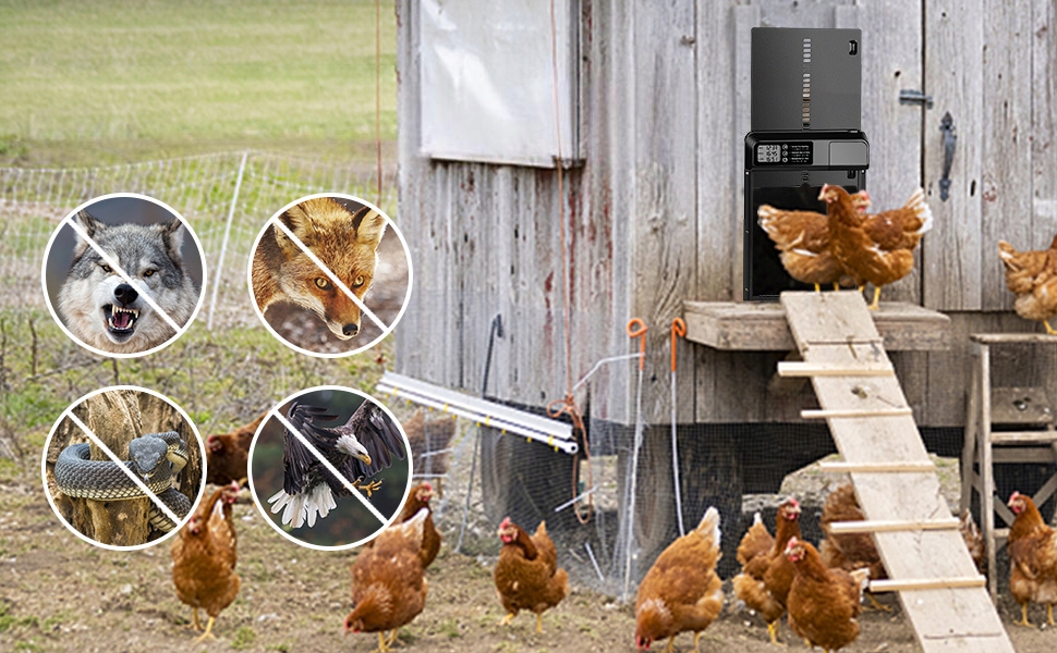 【Область применения】: Габаритные размеры автоматического курятника с дверным механизмом 32,5см*24,4см, длина двери 24,4см*21см, подходит для цыплят любого размера, уток, цыплят, цыплят и т. д., которые могут легко пройти, если ваши кошки и собаки меньше, вы также можете использовать его, он может эффективно защитить ваших домашних животных при ночь.