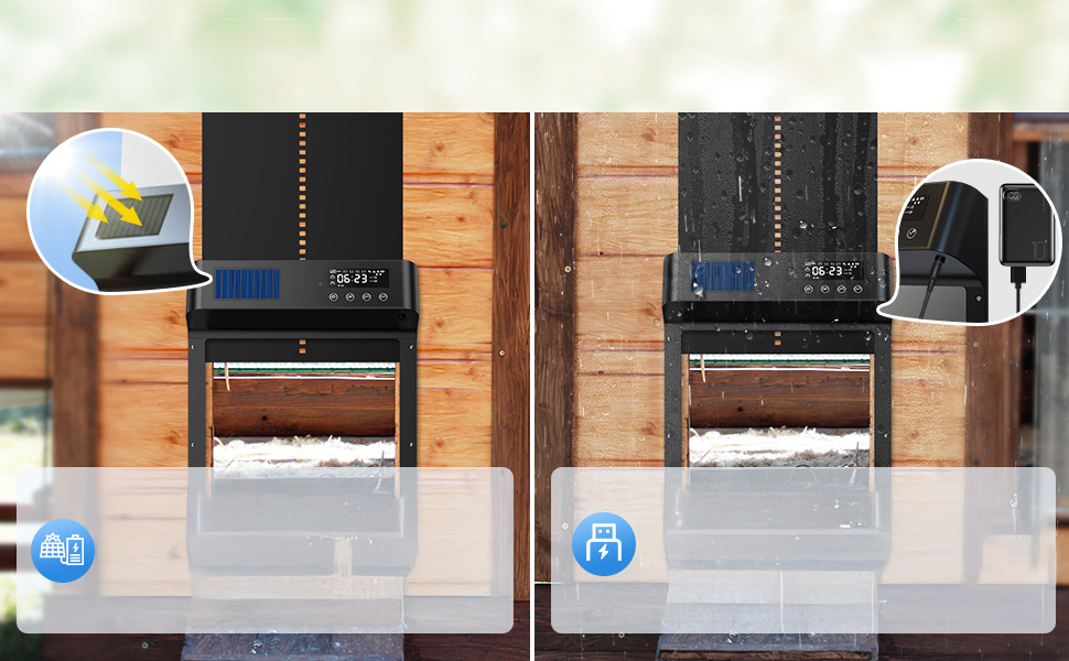 Этот автоматический клапан для цыплят оснащен большими батареями 5000 мАч и солнечными панелями с высоким преобразованием. Он может быть заряжен солнечной энергией в солнечные дни, что экономит деньги и удобно. Если вы используете зарядный кабель в различных погодных условиях, вам больше не нужно беспокоиться о проблемах зарядки в разных погодных условиях!