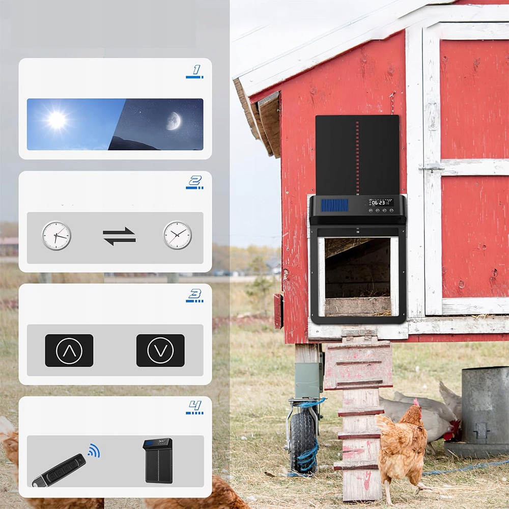 ▶ ️ ▶ ️- оснащен чувствительным датчиком, когда он обнаруживает цыплят, проходящие через дверь куриной двери, он автоматически прекратит закрытие и подъем. Солнце, закрытие на закате), режим таймера (временное открытие и закрытие), режим таймера и датчик света (временное включение/выключение в сочетании с включением/выключением датчика).