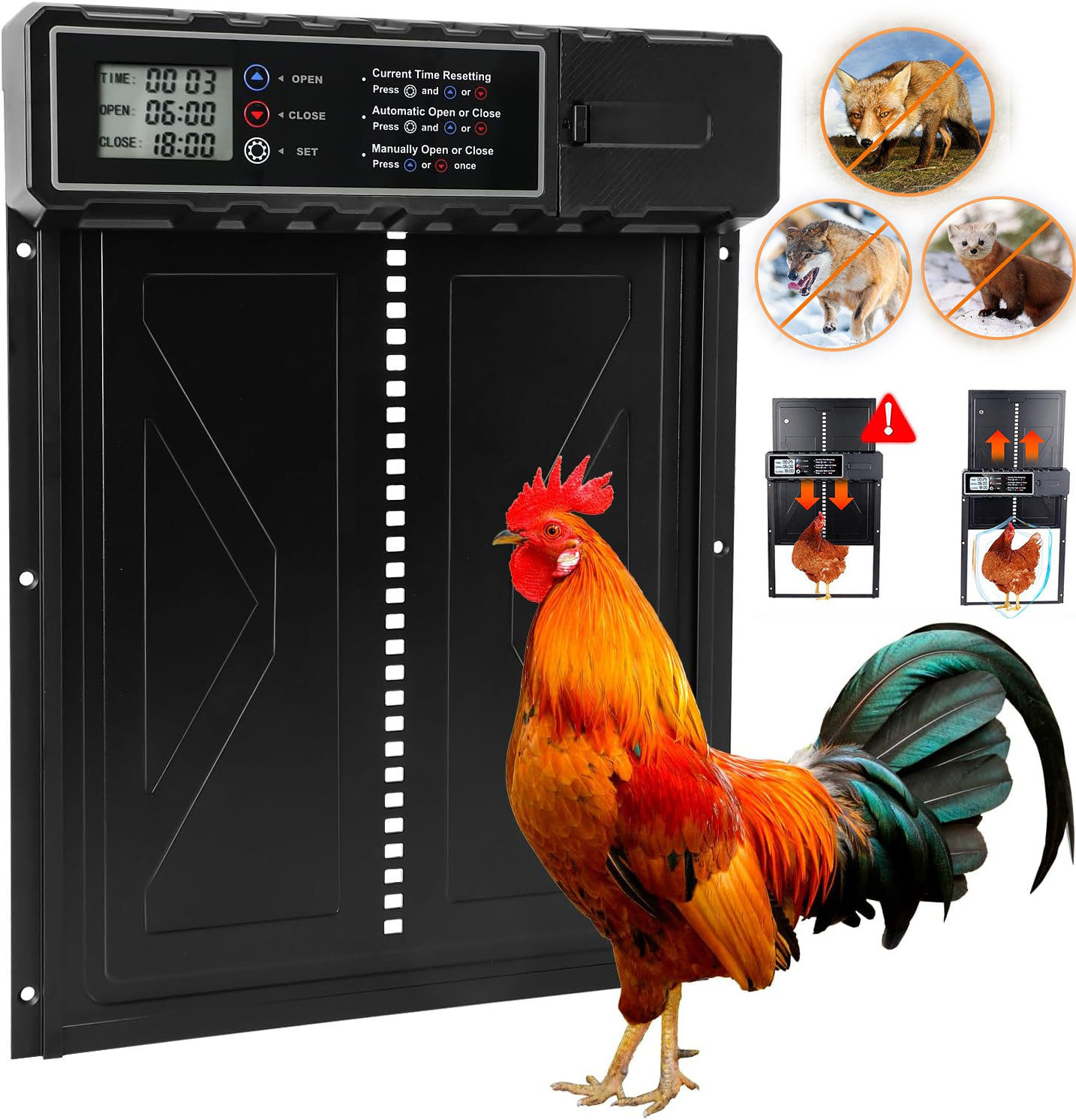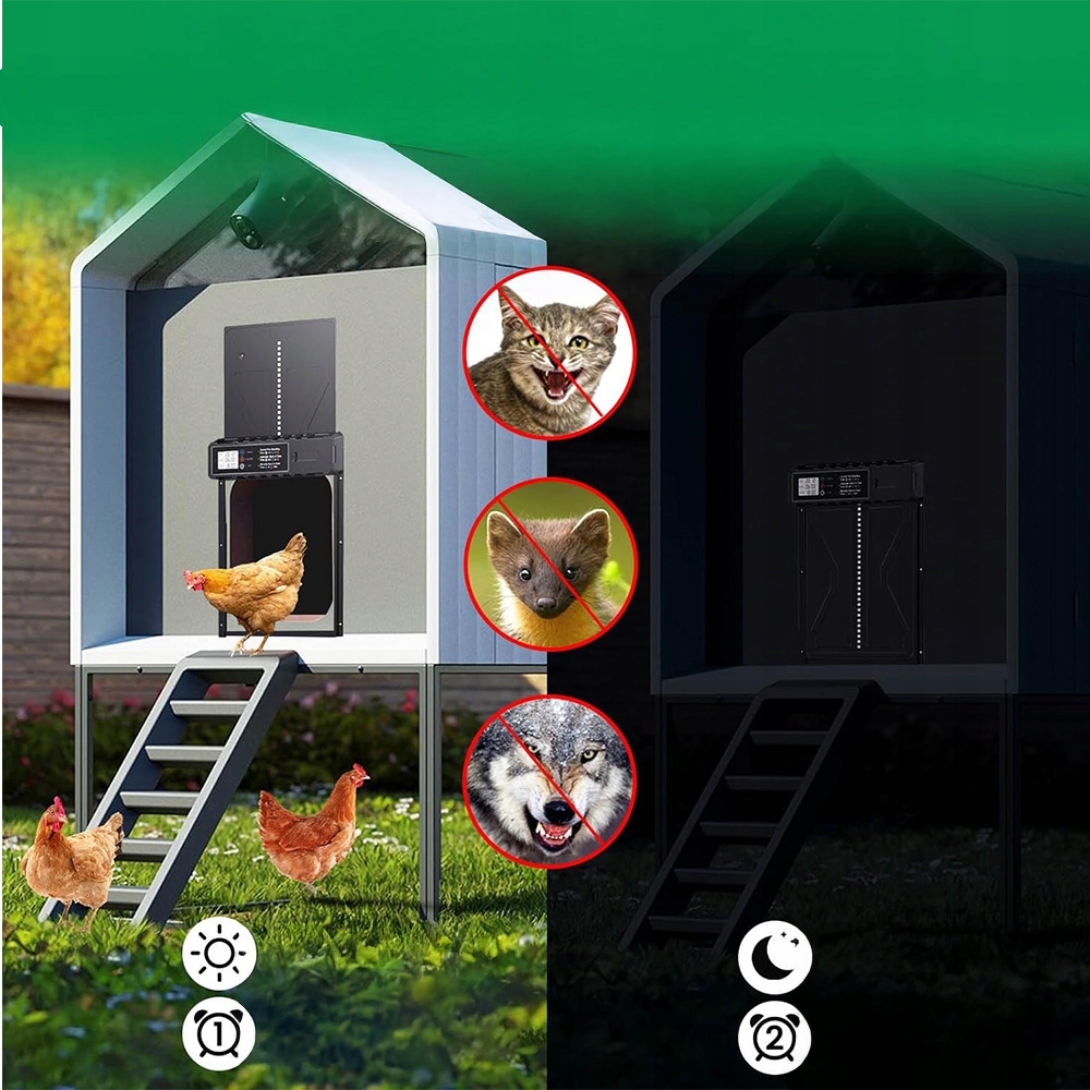🔷- Изготовлена из высококачественного алюминия, устойчива к коррозии и погодным условиям, надежно работает при температуре от -15°С до 55°С, обеспечивая оптимальную защиту цыплят. (Примечание: если на дверце образовался иней и лед, подождите, пока лед растает, прежде чем открывать или закрывать дверцу.)