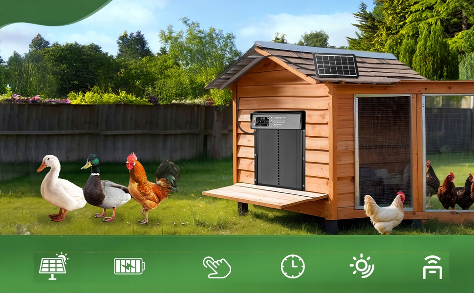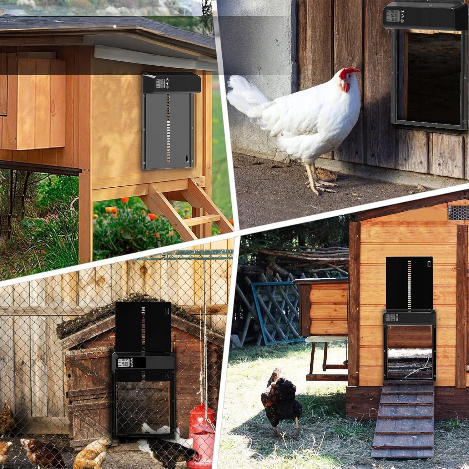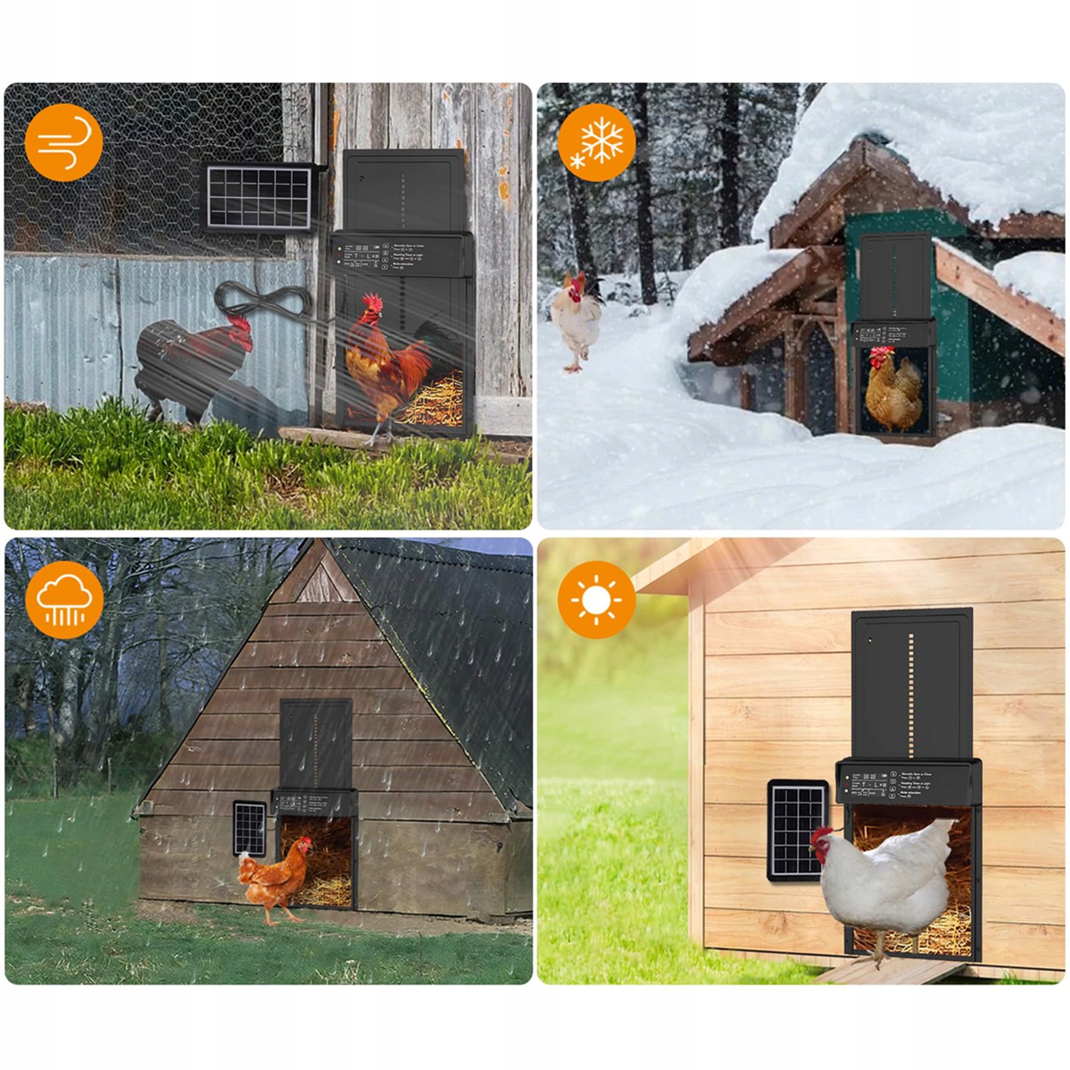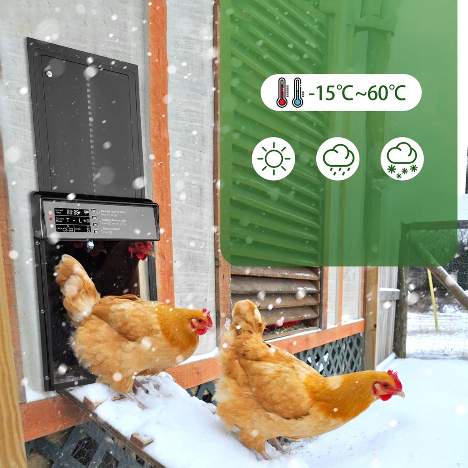 Открытие двери имеет размеры 13 "x 9,6", благодаря которой он подходит для большинства птицеводства и домашних животных и может использоваться внутри и снаружи. Дверь имеет функцию защиты от столкновения. Когда при открытии или закрытии обнаруживается курица или препятствие, дверь переключается в анти -колорный режим, обеспечивая нормальную работу после удаления препятствия.