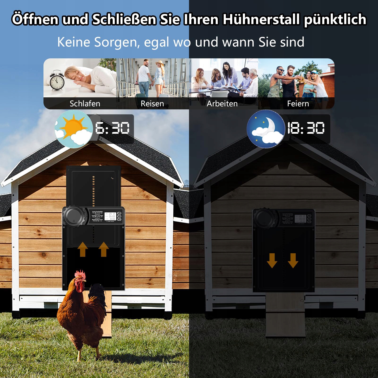 【 Два режима для эластичности 】: выберите между настройками между рукой или временем. Таймер можно установить точно, автоматическое открытие двери утром и автоматическое закрытие вечером. Независимо от того, находитесь ли вы в пути или просто наслаждаетесь расслабляющим утром, вы можете быть уверены, что ваши цыплята будут под большим заботом, не ограничивая ваше время и свободу.