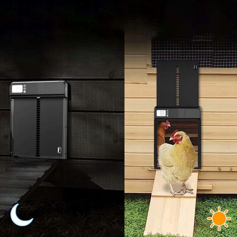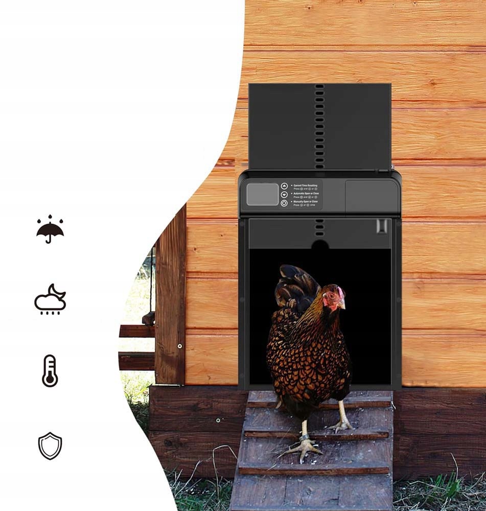 Эти автоматические двери в курятник безопасны и достаточно сильны, чтобы отразить других крупных животных и обеспечить безопасность птицы, водостойкость IP45, хорошо работает в дождливые или снежные дни.