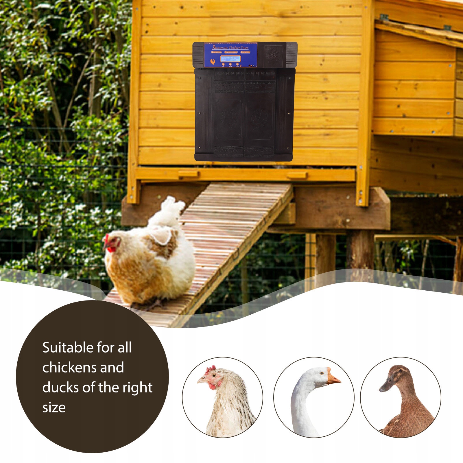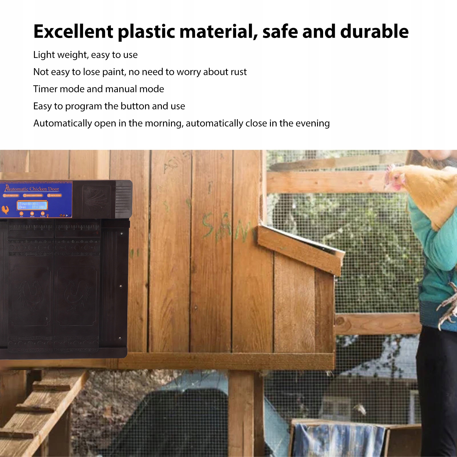 4. Безопасность: Благодаря текущей защите механизм открытия этой двери обеспечивает безопасность цыплят при открытии и закрытии двери. Кроме того, благодаря простым кнопкам программирования для автоматического открытия по утрам и закрытию ночью, это ценный аксессуар, который увеличивает комфорт жизни ваших цыплят и уток.