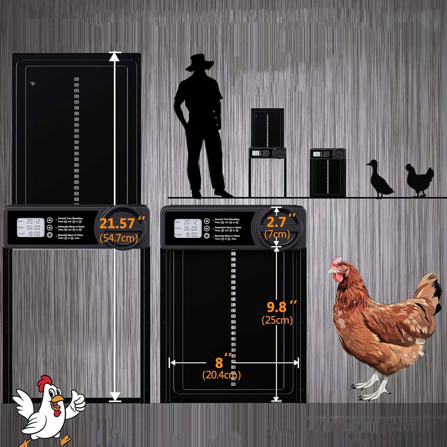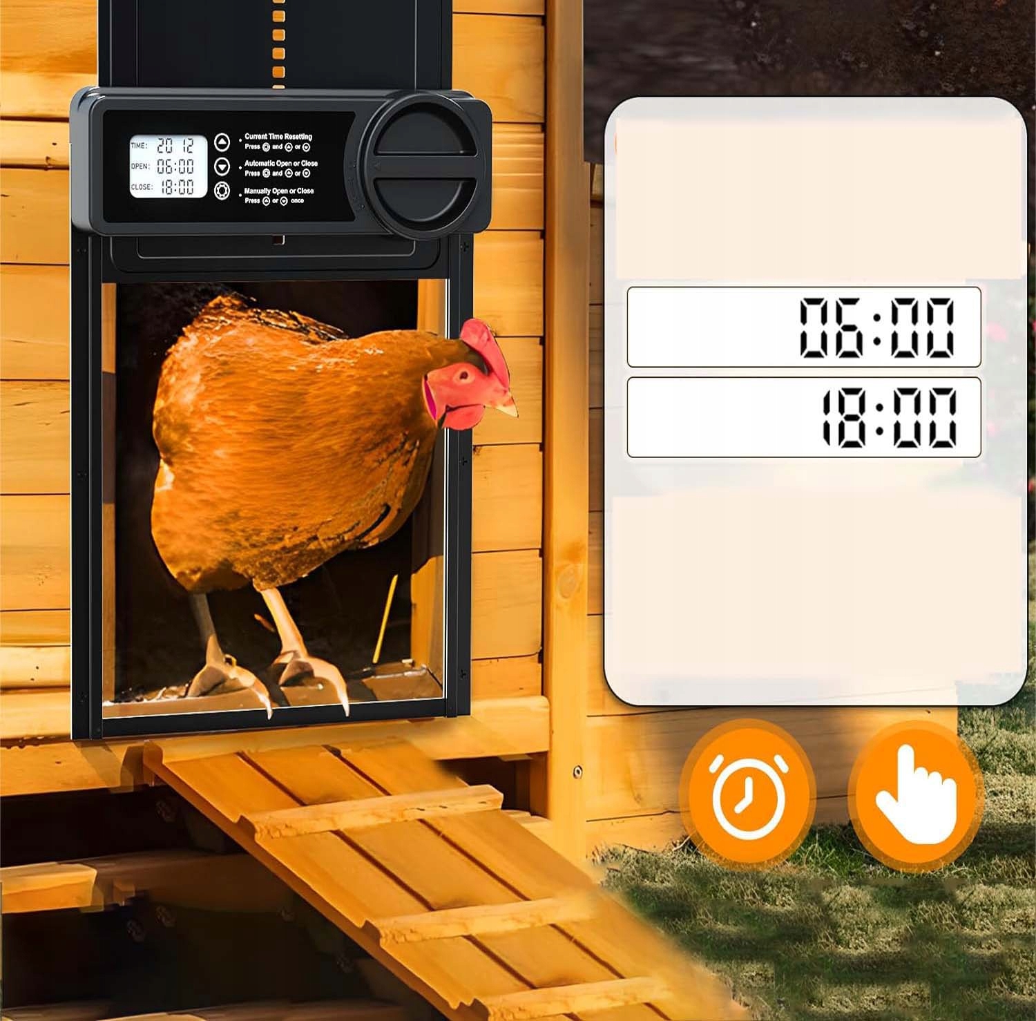 - Автоматическая дверь курятника оснащена встроенным ЖК-экраном, который позволяет легко и точно регулировать время открытия и закрытия. Установка проста и может быть выполнена всего за 10 минут без сложной электрической установки.