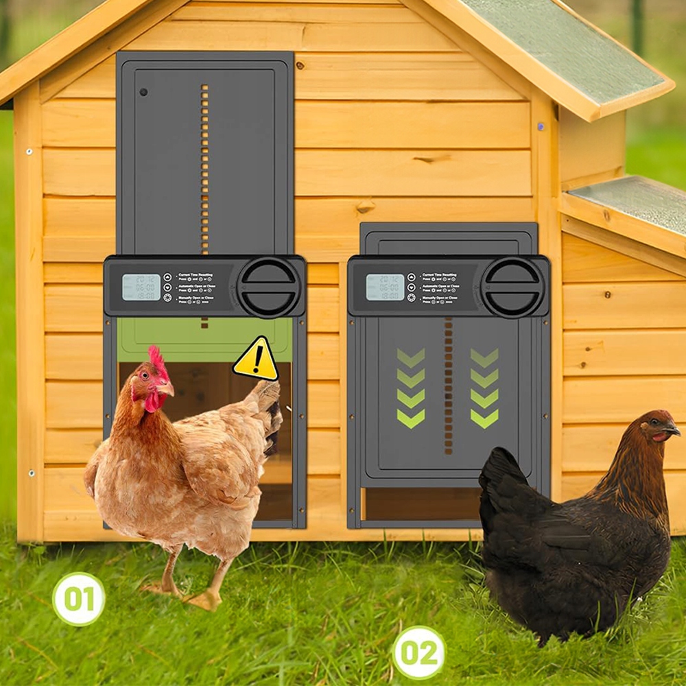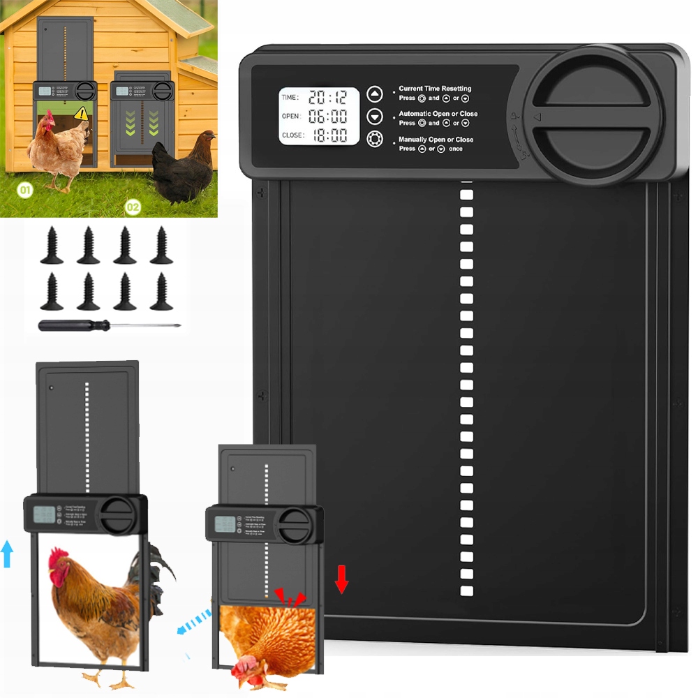 Автоматические двери куриного куча оснащены интегрированным ЖК -экраном, который обеспечивает простое и точное регулирование времени открытия и закрытия. Установка проста и может быть сделана без сложной электрической установки.