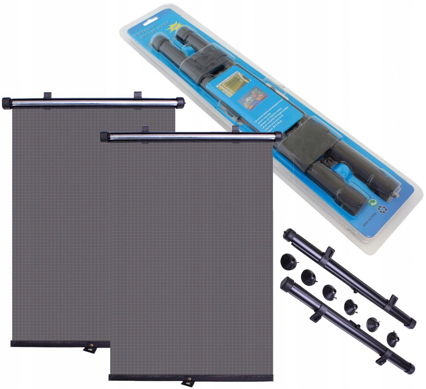 Солнцезащитные шторки защищают пассажиров от чрезмерного солнечного излучения и существенно снижают нагрев салона автомобиля. Набор присосок и крючков позволяет легко установить шторку на лобовое стекло автомобиля.