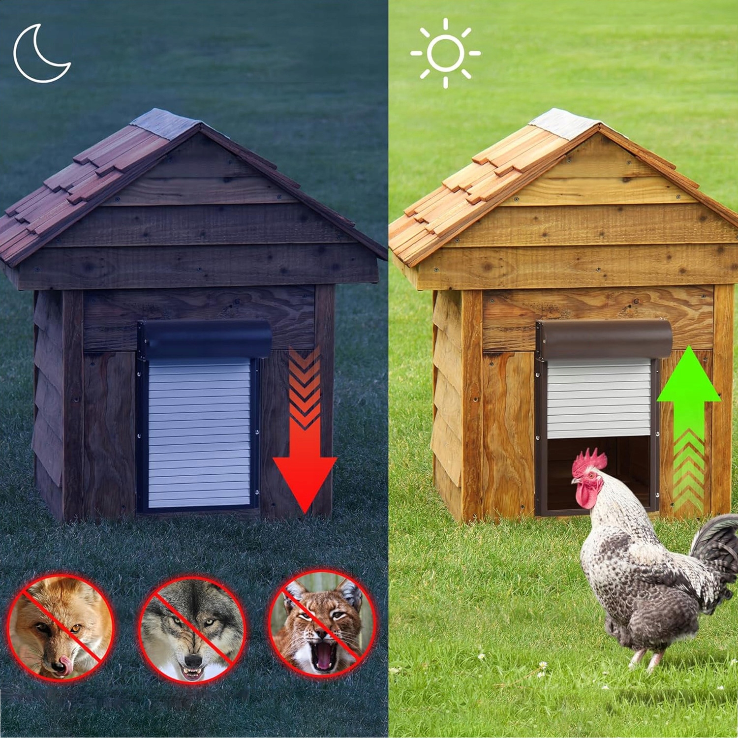 Автоматические двери для куриного курятника, питаемого солнечной энергией, оснащены датчиком препятствий. Если дверь сталкивается с препятствием при уходе, они автоматически останавливаются или увеличиваются, чтобы обеспечить безопасность очаровательных цыплят и предотвратить собак, кошек, ласков, змей и других цыплят. Эти двери также могут быть использованы в центрах утки и гуся.