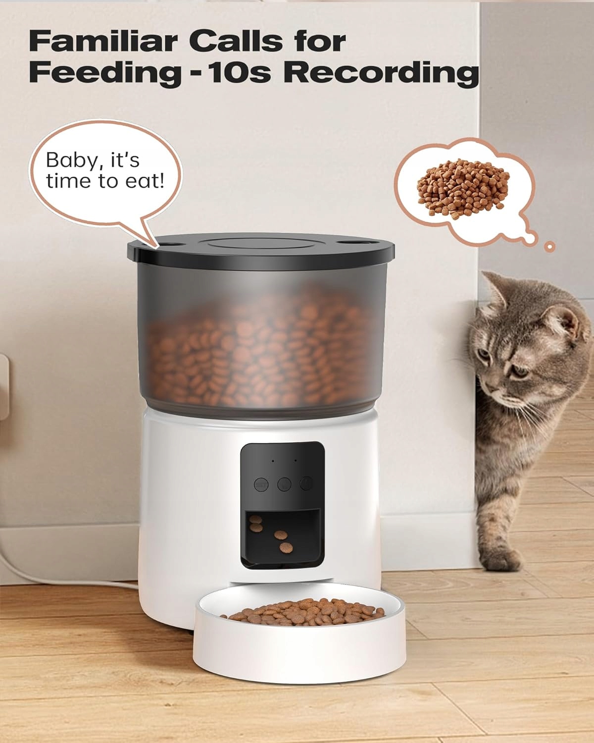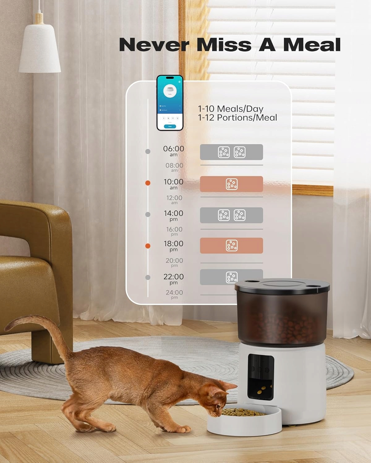 ☑️ Гибкий контроль времени кормления: автоматически подает еду равномерно и может быть запрограммирован на доставку 1–10 приемов пищи в день в заранее определенное время, по 1–12 порций каждая, что помогает вашему питомцу развивать здоровое питание. привычки. WiFi Smart Control помогает вашему питомцу не переедать, контролировать его вес и вести более здоровый образ жизни.