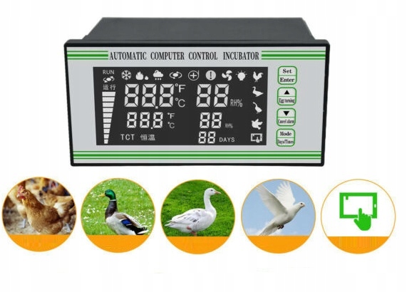 Контроль: контроль температуры (основной и вспомогательный нагреватель), регулировка влажности, вентиляция/перегрев, вращение яиц (справа и слева), тревога.