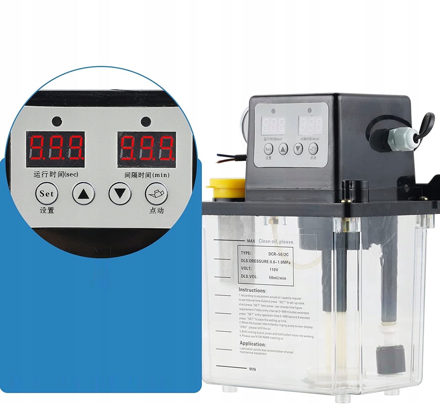 Рабочее время составляет 1–60 секунд, а время перерывов — 3–999 минут, которое можно регулировать в соответствии с потребностями механического оборудования. (Пожалуйста, используйте в рекомендуемом диапазоне, чтобы масляный насос мог работать нормально)