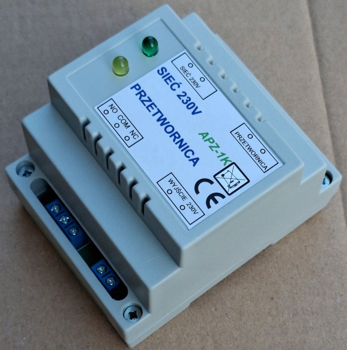 apz-1K также имеет дополнительный вспомогательный контакт. Это 3-контактный контакт переключения передатчиков: Common Com, открыть NC и № переключения. При сборе электроэнергии из сети (1) контакт компактный без NO, в то время как не используется энергопотребление из сети (1), контакт компактен с NC (и открывает от NO).