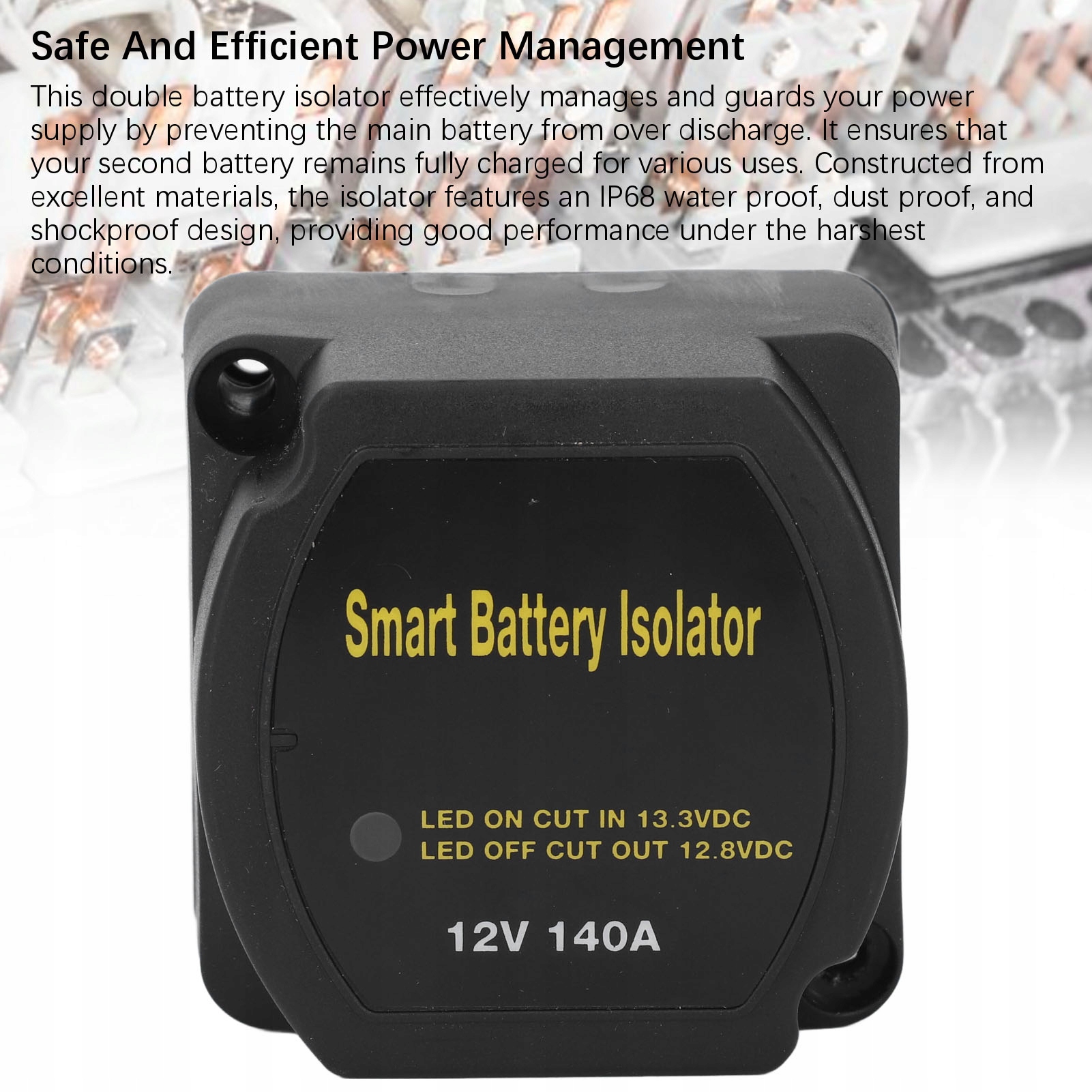 4. Безопасное и эффективное управление энергией: этот двойной изолятор аккумулятора эффективно управляет и охраняет источник питания, предотвращая бирку дерьмовой батареи. Это гарантирует, что вторая батарея остается в Peni для различных применений. Изолятор, построенный из идеальных материалов, обладает водоснабжением IP68, доказательством пыли и сопротивлением ударов, обеспечивая хорошие результаты в самых сложных условиях.