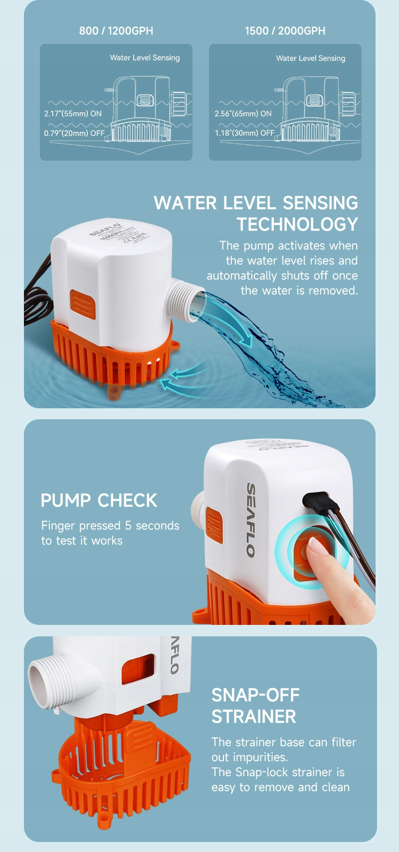 Автоматический режим — встроенный датчик воды включает и выключает насос без необходимости использования внешнего поплавка или ручного управления.
