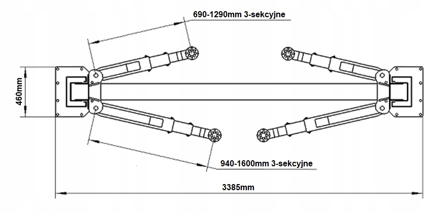 4T грузоподъемность в сочетании с идеально подобранными рычагами являются основными преимуществами представленной модели. Передние и задние подъемные рычаги имеют трехсекционную телескопическую конструкцию. Наименьшее расстояние между рычагами (690 мм) позволяет поднимать небольшие пассажирские автомобили. Максимальное расстояние между рычагами (1600 мм) необходимо для стабильного позиционирования и безопасной эксплуатации длинномерных транспортных средств. Рычаги подъемника асимметричны и складываются наружу, что позволяет сохранять оптимальную балансировку поднимаемого автомобиля. В стандартную комплектацию подъемника входят два комплекта проставок высотой 52 мм и 120 мм. Они необходимы при обслуживании развозных фургонов с тентом и внедорожников, поднимаемых за раму. Опоры, расположенные под автомобилем, отвинчиваются и крепятся к рычагам и проставкам.
