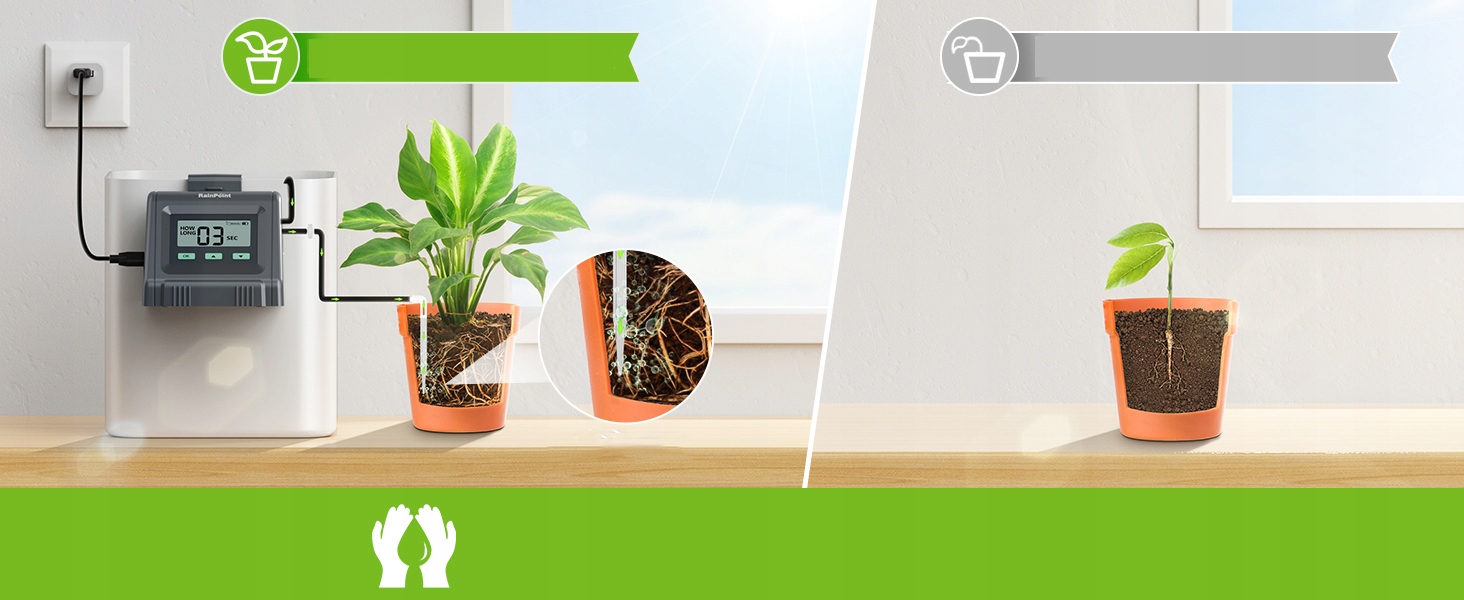 Система полива домохозяйки поддерживает 11 горшков. С функцией автоматического полива вы можете установить интервал полива (каждые от 1 часа до 7 дней) и продолжительность (от 20 до 30 минут). Поставляя воду непосредственно к корням растений, уменьшение поглощения воды и экономия до 70% воды.