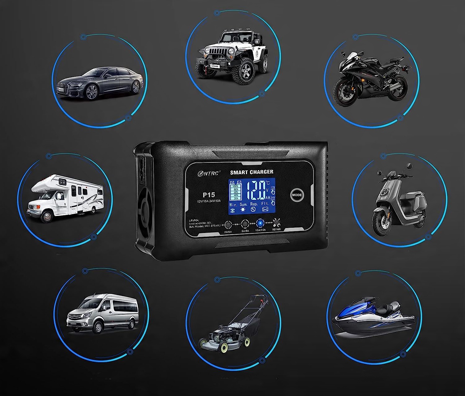 Зарядное устройство совместимо с различными типами аккумуляторов, включая свинцово-кислотные и AGM, что делает его идеальным для многих типов транспортных средств.