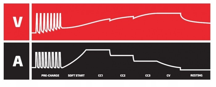 - Стадия 4 - CC1, CC2, CC3 (постоянный ток - ток тока тока) - быстрая зарядка. Ток зарядки устанавливается автоматически в зависимости от состояния заряда аккумулятора