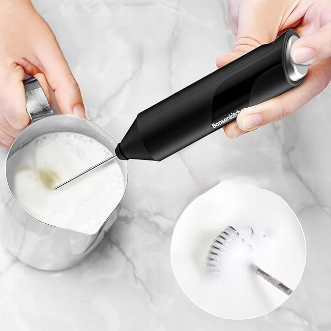 Bonsenkitchen Электрический вспениватель молока, ручная стержень для кофе, латте макиато, капучино, матча, на батарейках, мешалка для кофе - черный