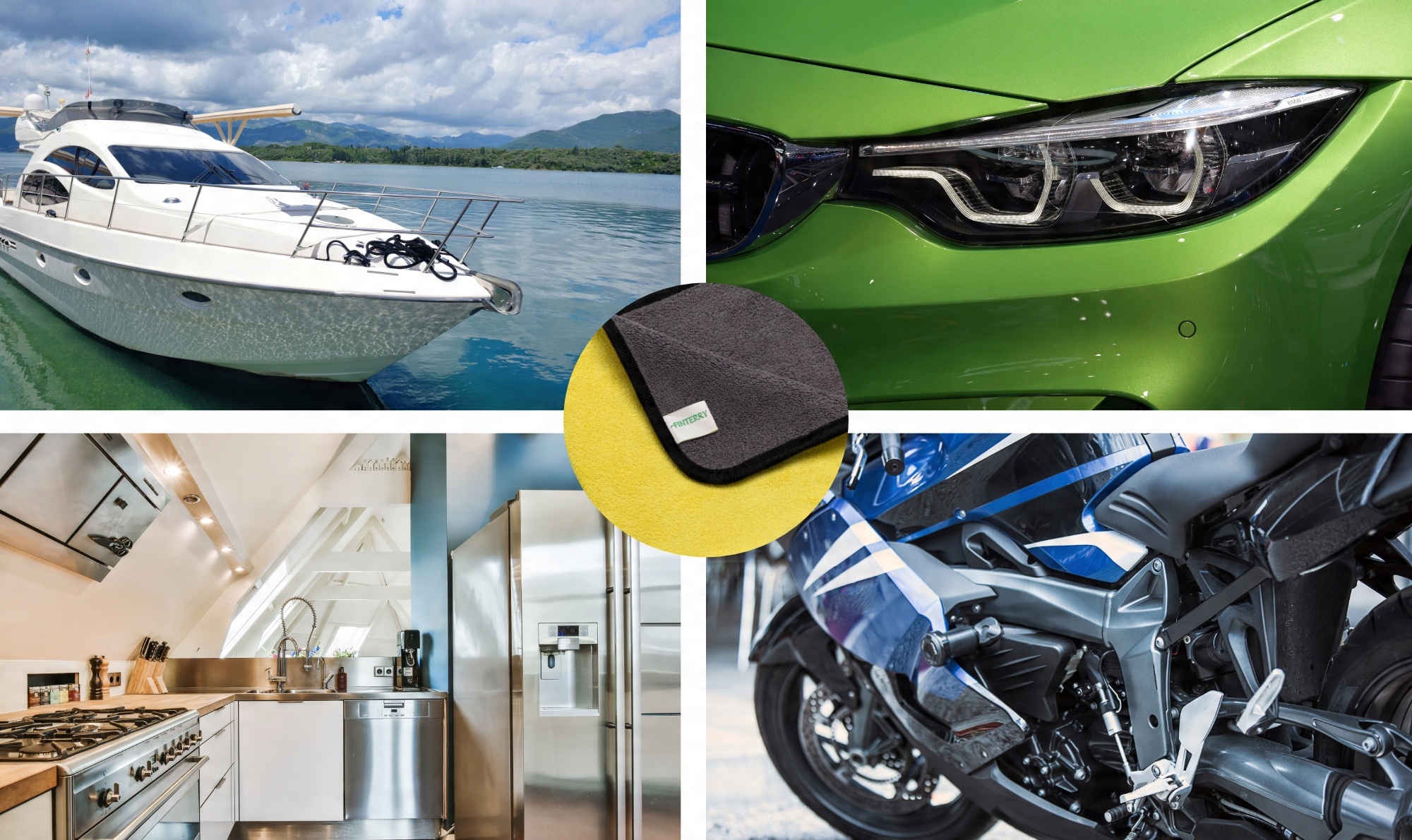 Двусторонний материал из микрофибры: Изготовлен из 80 % полиэстера, 20% полиамид, идеально подходит для различных применений, от полировки до очистки. Материал бережно воздействует на чувствительные поверхности, такие как автомобильная краска, зеркала, окна, посуда.