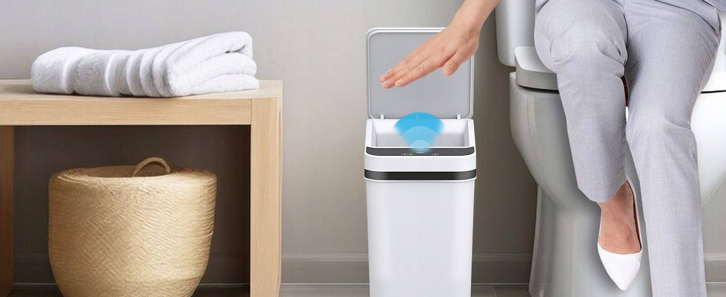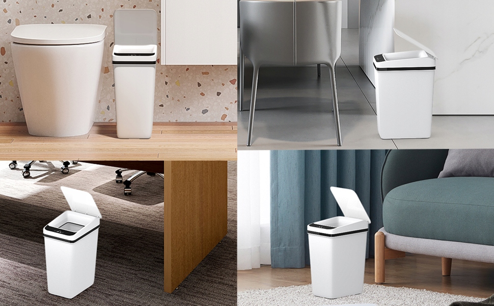 - Этот мусорный бак с датчиком движения имеет тонкий профиль и идеально подходит для ванных комнат, спален, кухонь и различных помещений, где пространство ограничено.